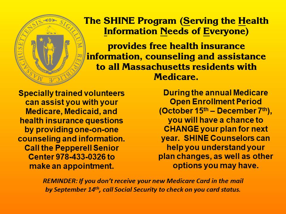 Posted on: September 8, 2018[ARCHIVED] SHINE - Medicare counseling @ Pepperell Senior Center