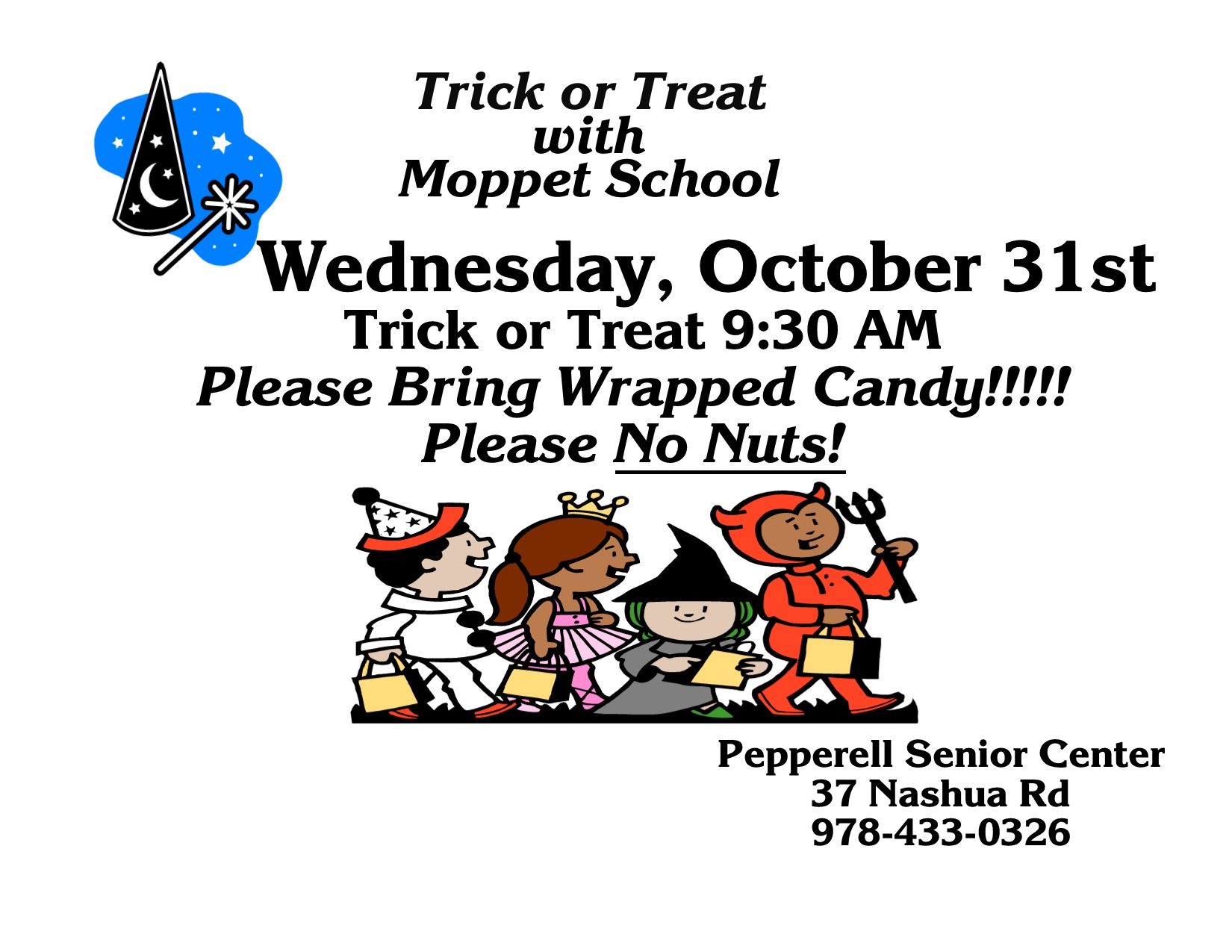 Don’t miss out on the pageantry of Halloween Trick or Treating! The little ghouls are coming to us! Toddlers and Preschoolers from The Moppet School and other local preschools are invited to Trick or Treat here at the Senior Center for a brief time Halloween morning on their way to school.