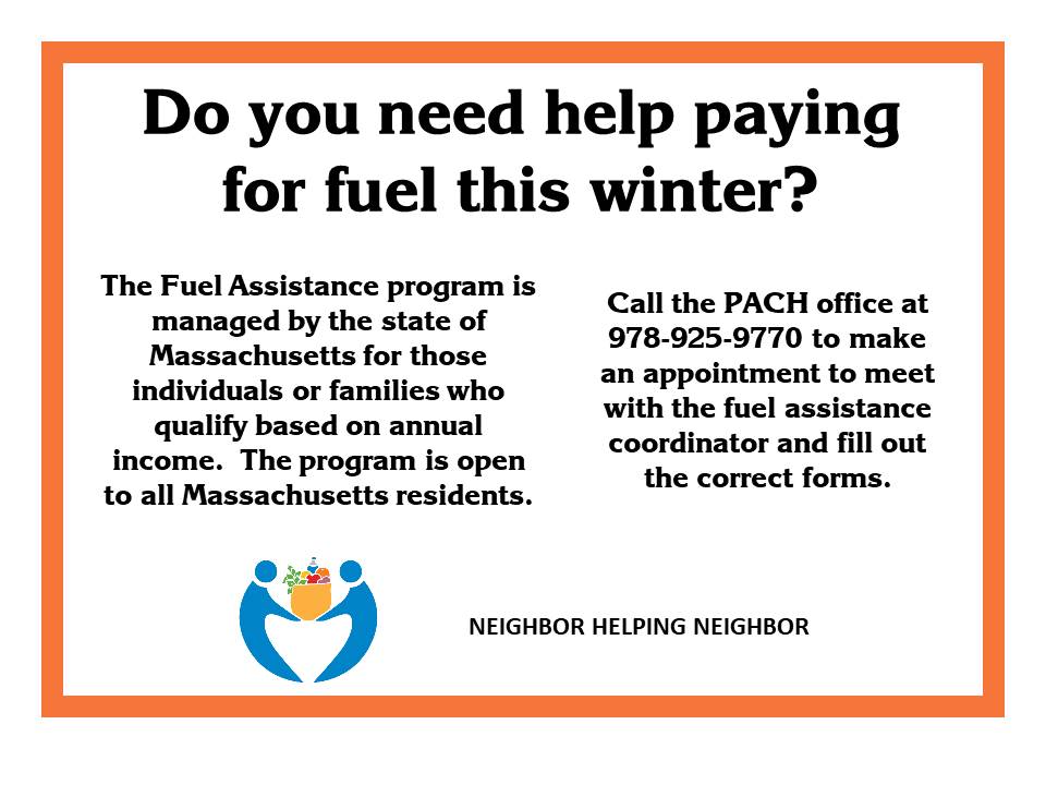Call the PACH office at 978-925-9770 to make an appointment to meet with the fuel assistance coordinator and fill out the correct forms.