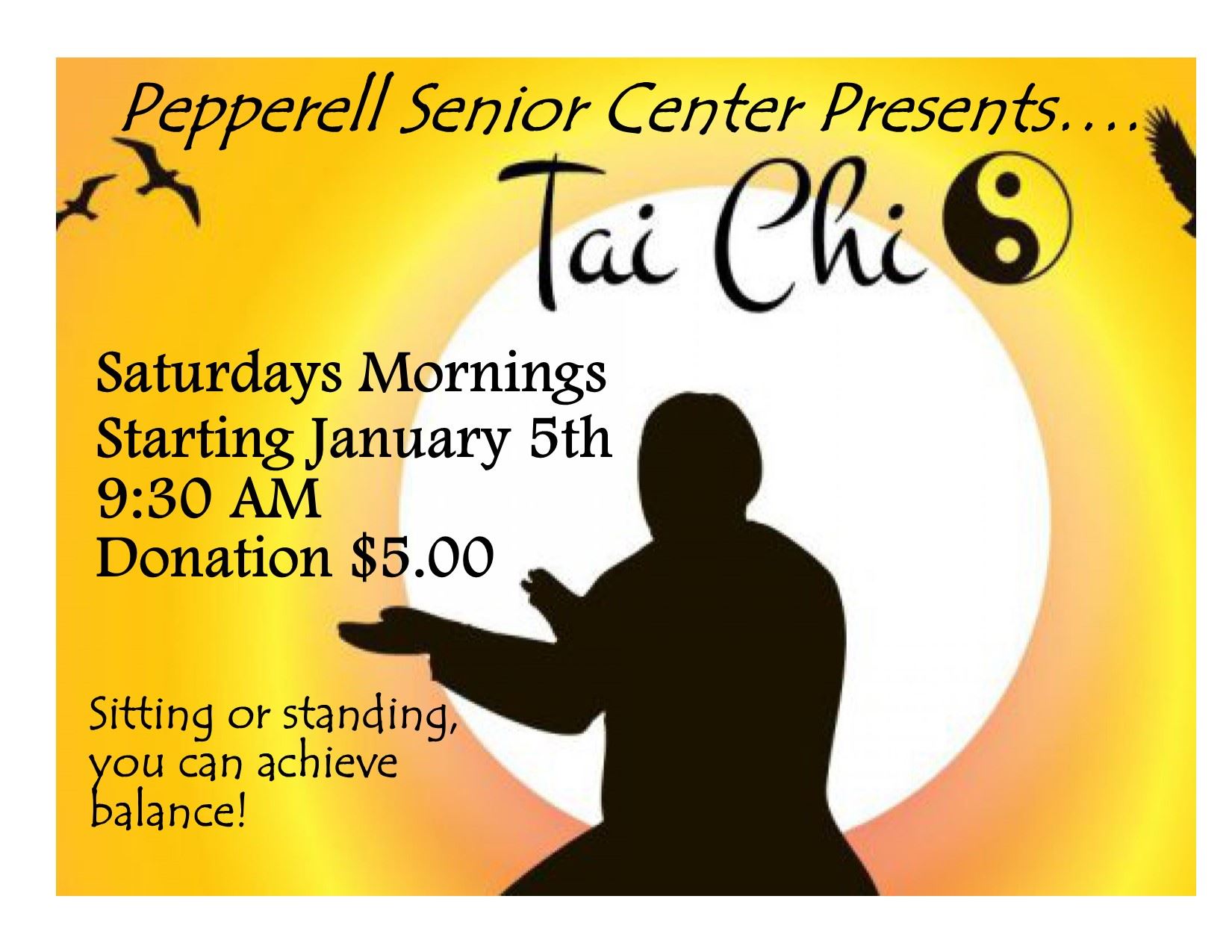 Tai Chi Saturdays 9:30 AM to 10:30 at the Pepperell Senior Center.  Starting January 5th,