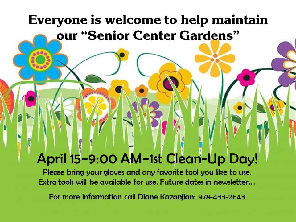 Come help maintain the beautiful gardens at the Senior Center. For more info call Diane Kazanjian 978-433-2643.