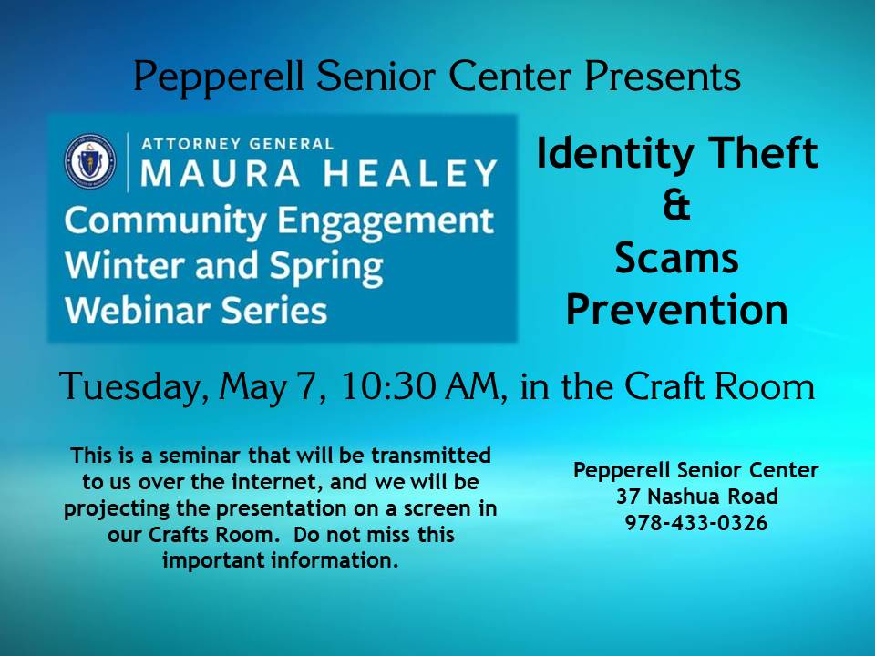 This presentation is produced by Massachusetts Attorney General Maura Healey. It will be transmitted to us over the internet. For our convenience, the Pepperell Senior Center will be projecting this on a screen in our Crafts Room. Do not miss this important information.